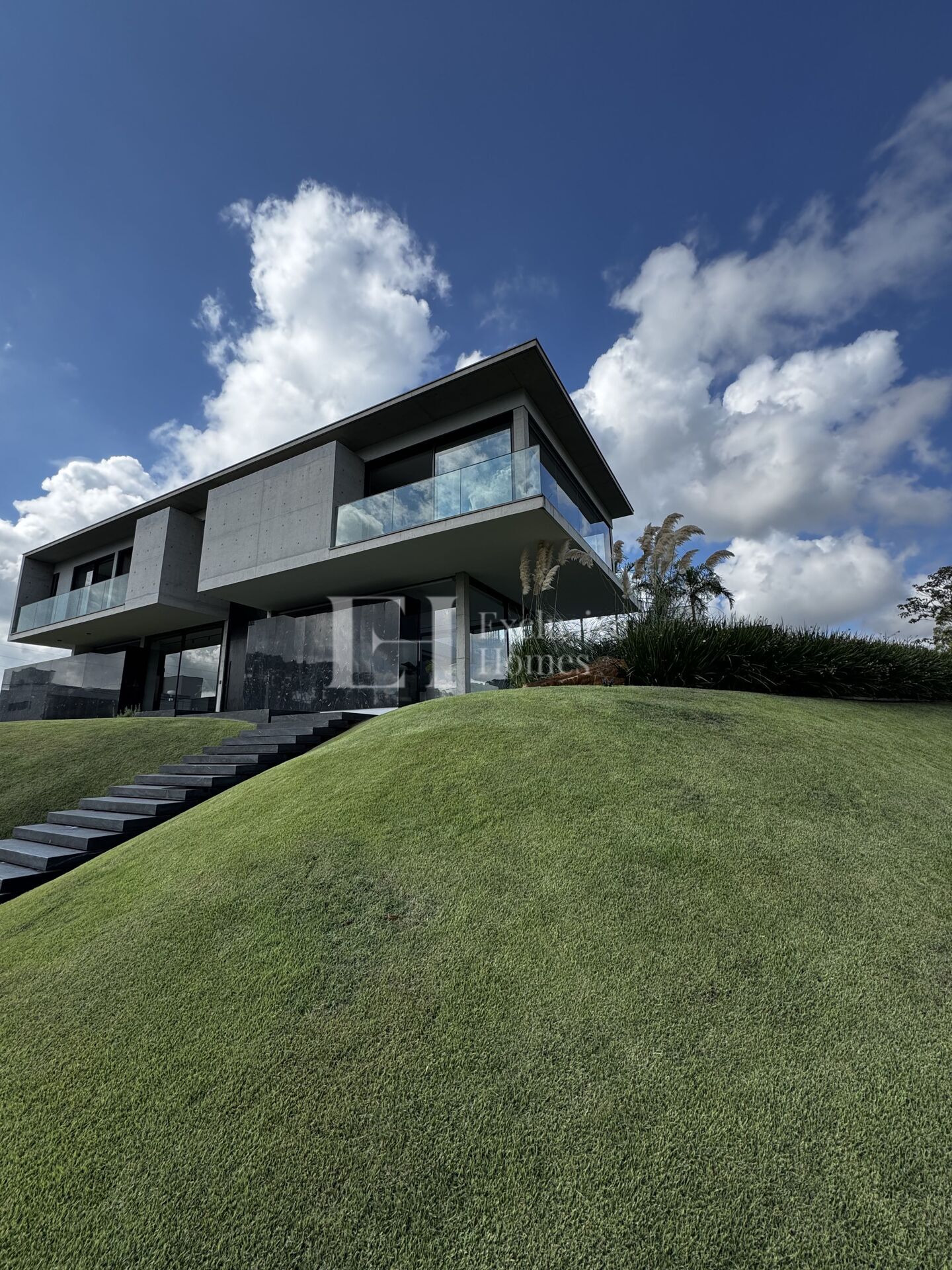 Esta residência única combina sofisticação, tecnologia e natureza em perfeita harmonia. Construída com *concreto aparente* e *madeira natural*, a casa valoriza elementos nobres e sustentáveis, criando um ambiente acolhedor e elegante.